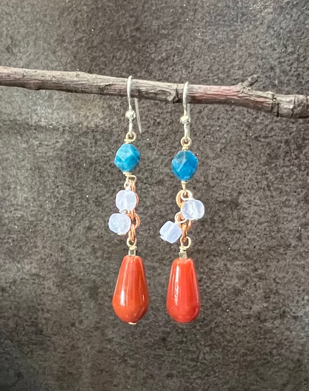 Handcrafted from carnelian drops, chalcedony and appetite, copper and sterling silver ear wires.