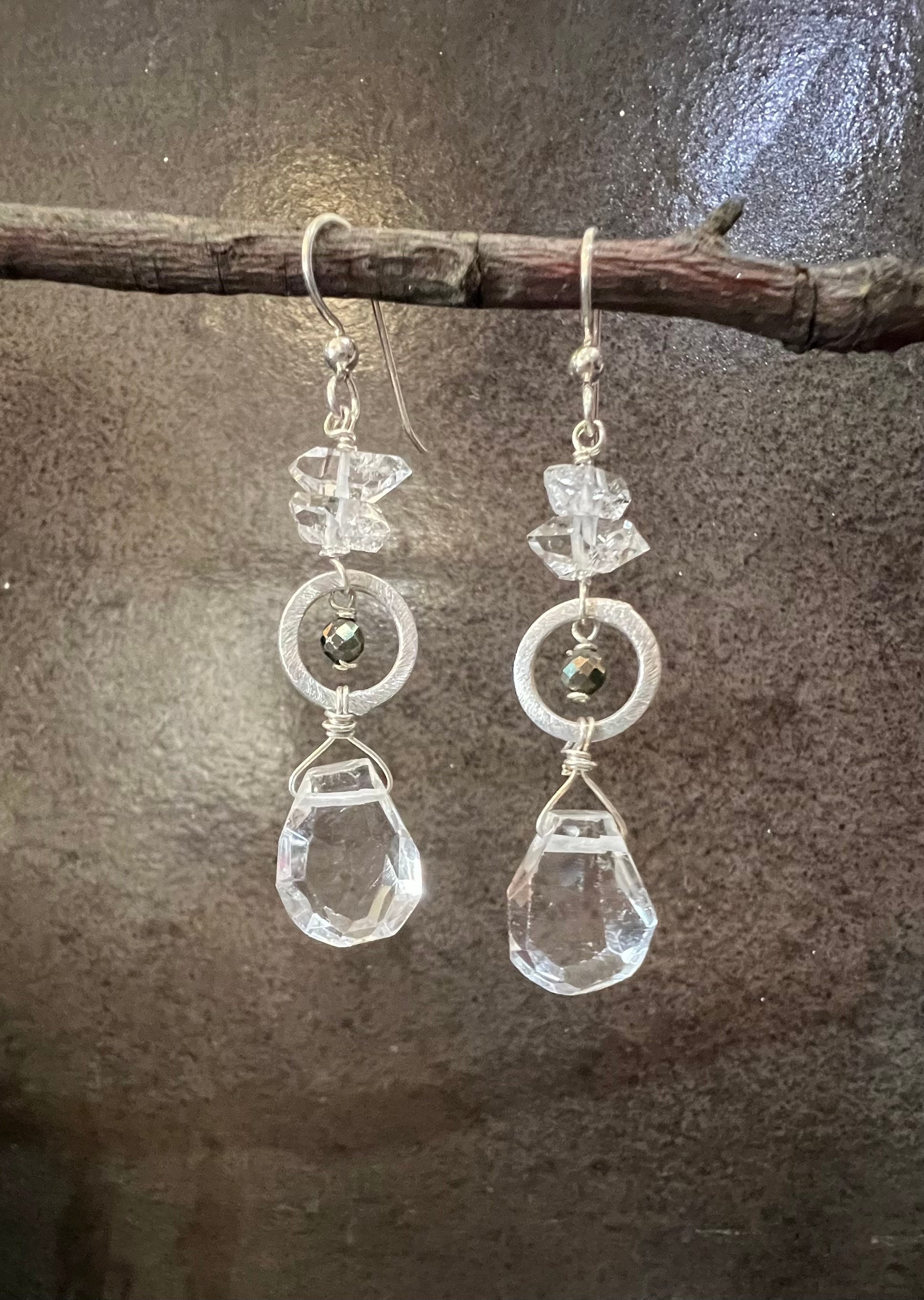 Hand crafted earrings made with sterling silver wire and faceted Quartz drops, with Herkimer "diamond" crystals and pyrite.